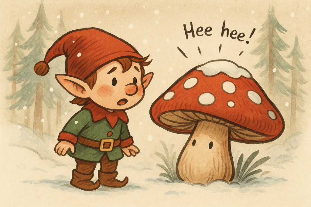 Schon wollte Emil aufgeben, da hörte er leises Kichern. Hinter einem verschneiten Pilz saßen drei winzige Baby-Wichtel, rotbäckig und neugierig.