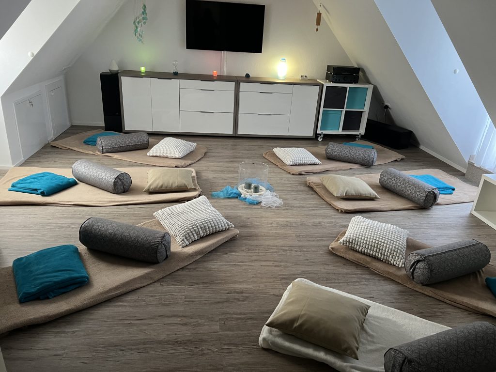 Zur Unterstützung bei den Asanas stehen Yoga-Bolster zur Verfügung.